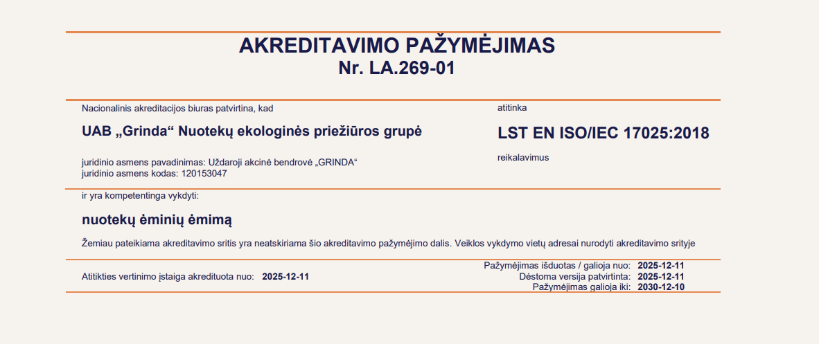 Nuo 2026 m. sausio 1 d. įsigaliojant reikalavimui aplinkos taršos monitoringą vykdančioms įstaigoms turėti ėminių ėmimo sertifikatą, Vilniaus miesto tvarkymo įmonei „Grinda“ suteikta paviršinių nuotekų ėminių ėmimo akreditacija.